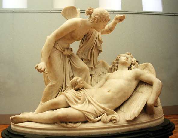 Así pasan mucho tiempo hasta que una noche Psyque nota que su amante esta dormido, la curiosidad la puede y aprovecha el momento para encender una lámpara y acercarla a su rostro, cuando ve que se trata de Eros el dios del amor, le tiembla el brazo y una gota de de cera cae sobre él despertándolo entonces el se despide de ella diciéndola «No debiste hacer eso, ahora que sabes quien soy nuestro amor no puede ser y por tanto no puedo amarte»
